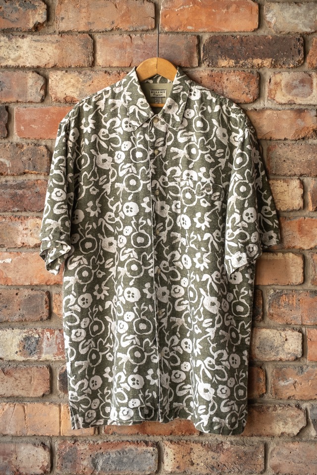 ・bugle boy ramie×cotton hawaiian shirt ビューグルボーイのハワイアンシャツです。 古着屋さんでも90’s~のitemを中心に チラホラ見掛ける”Bugle Boy”より Ramie 55%×Cotton 45%の異素材ハワイアンシャツ。 あまり聞きなじみの無いRamie(ラミー)素材ですが、 麻の一種となり、リネンに比べて少しハリのある質感に 速乾性に優れておりリネン同様、夏にピッタリの素材。 Cottonが配合されているのでシワも付きにくく 自宅での取り扱いも楽かと思います◎ サイズ表記はMediumですが 作りは大きめとなり、嵌る方も多いサイジング。 渋さのある”オリーブグリーン”は肌馴染も良く 嫌なリゾート感の無いLooksは街着として 取り入れやすい佇まいです。 また、こういった色味はVintageでは中々見掛けないので この年代故の魅力かと思います。 コンディションも良く、落ち着きのある配色から 様々なStyleに落とし込める一枚。 手の出しやすい価格帯から 初Hawaiian Shirtなんて方にもお勧めですよ~ model 170cm 細身 【condition】 目立った汚れ等無く 普段から古着を着ている方であれば 問題無く着用して頂けるかと思います。 【size】 肩幅 51cm 袖丈 28cm 身幅 59cm 着丈 78cm ※38clothing base shopに掲載の商品は 店頭と並行して販売しております。 その為、行き違いでsold outの場合が御座います。 1点物の古着、ご了承下さいませ。 O52-22