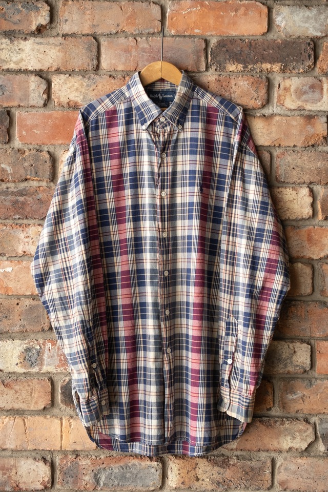 ・ralph lauren b/d light cotton check shirt ラルフローレンのB/Dコットンチェックシャツです。 定番ラルフのボタンダウンシャツ。 素材にカラー、モデルと数多く存在し 古着好きの収集癖を刺激するItemの一つですね。 古着屋さんでもよく見掛けるItemが故に 決め手に欠けている方も多いのでは? そんな中、今回”三点留め×マチ付き”の 1960’sのライトシャツを彷彿とさせるLooks 素材もしっかり100% Cottonっと 旧いitemがお好きな方にも 袖を通して頂けるクオリティかと思います。 Navy.Burgundy.Yellow等 落ち着いたトーンのマドラスチェック ディティールに配色からクラシカルに合わせたい一枚ですね。 また大きいサイズが多いラルフローレンですが 今回は嬉しいMedium表記 体格にもよりますが、少し大き目な作りなので 普段Largeを羽織る方にも着て頂けるかと思います。 スラックスやジャケットにコート等 綺麗めなitemとは勿論、 着用画像の様にMilitary等 無骨なItemとのギャップも楽しめる一枚ですよ? シャツ類お探しの方は是非是非。 model 170cm 細身 【condition】 目立った汚れ等無く 普段から古着を着ている方であれば 問題無く着用して頂けるかと思います。 【size】 肩幅 51.5cm 袖丈 61cm 身幅 61cm 着丈 82.5cm ※38clothing base shopに掲載の商品は 店頭と並行して販売しております。 その為、行き違いでsold outの場合が御座います。 1点物の古着、ご了承下さいませ。 O58-17