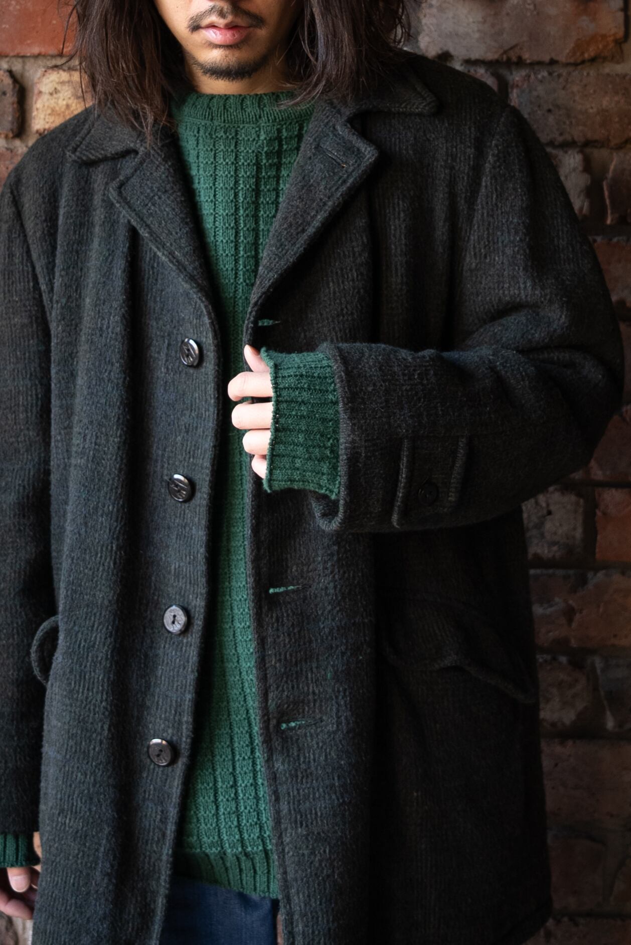 アウターからチラッと見えるグリーンが