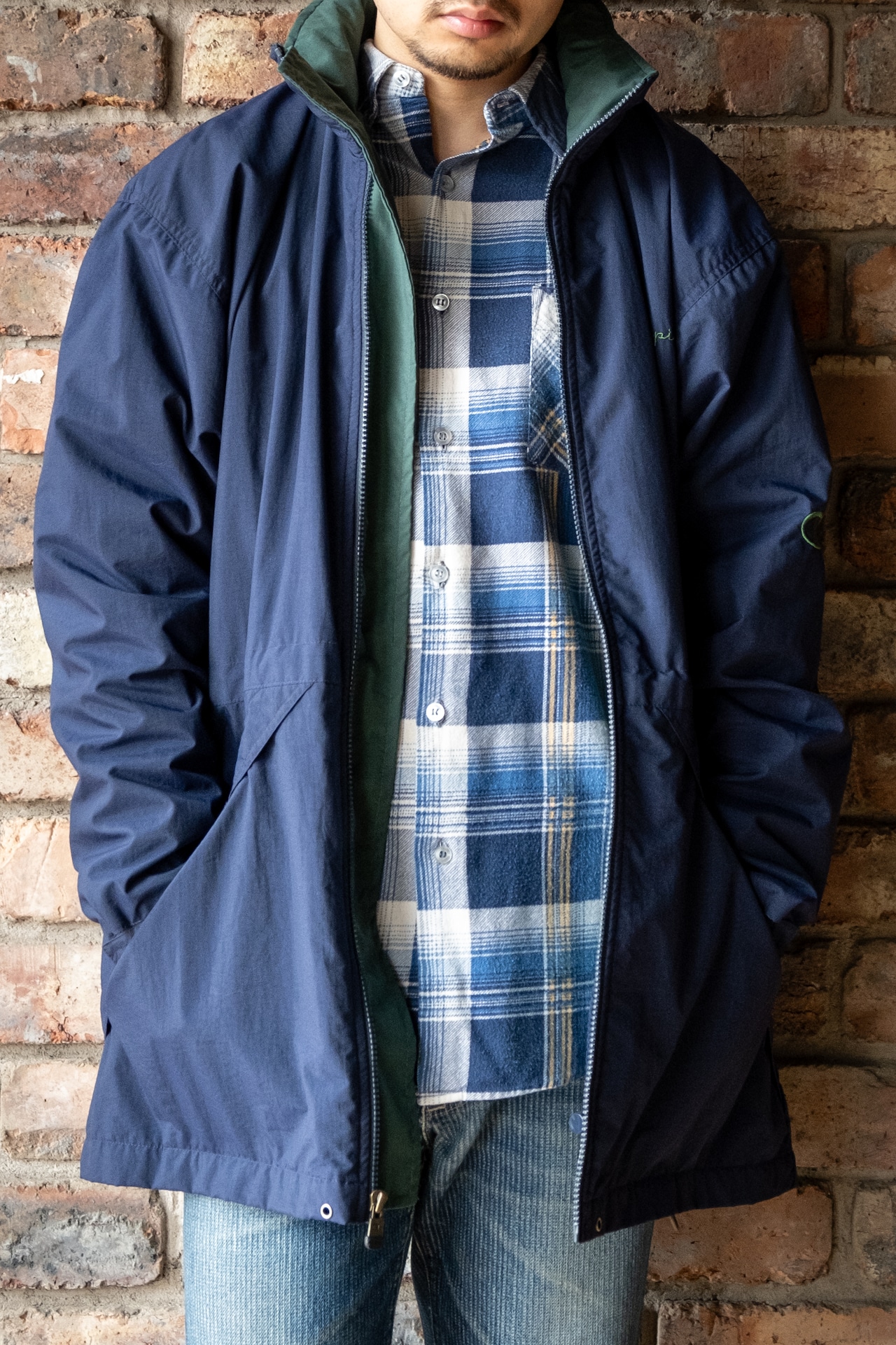 ネイビーボディにブランドの刺繍、裏地はグリーンとなり